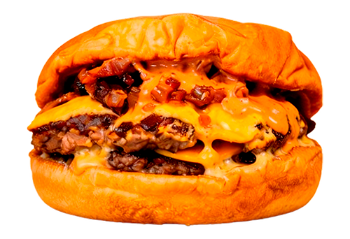 Double patty 100% fresh dry aged beef, Smoked cheddar cheese, grilled onions, pickles and house sauce on a street bun